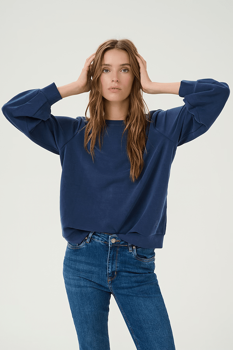 This is a casual fit sweater by My Essential Wardrobe. It is finished with rib at the neck, cuffs and bottom hem