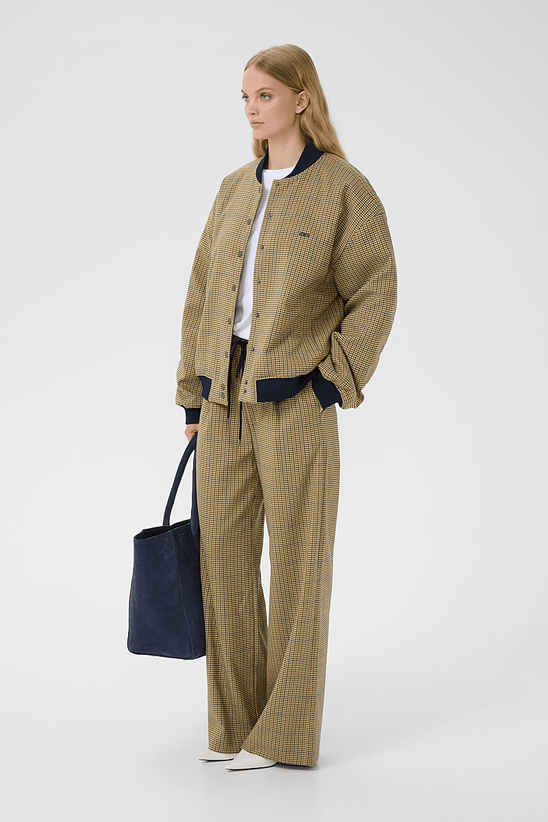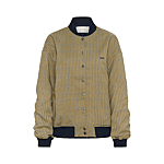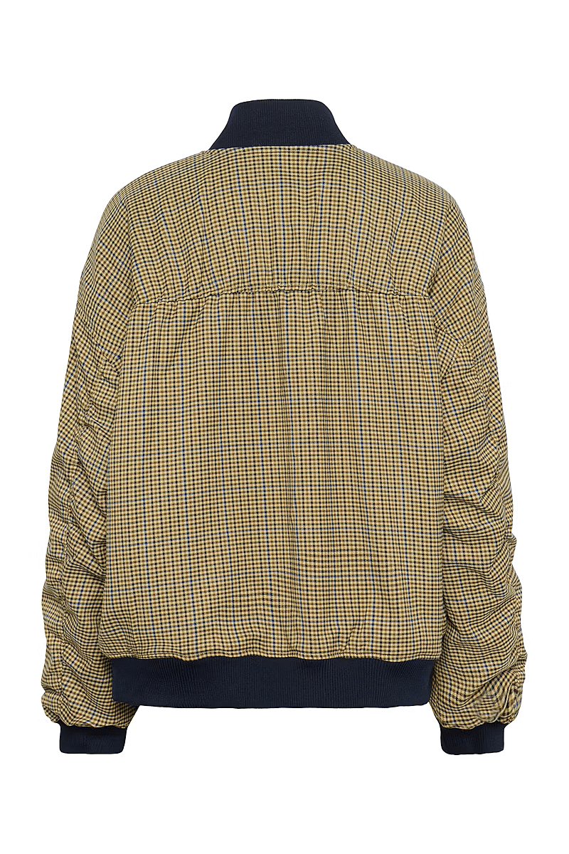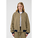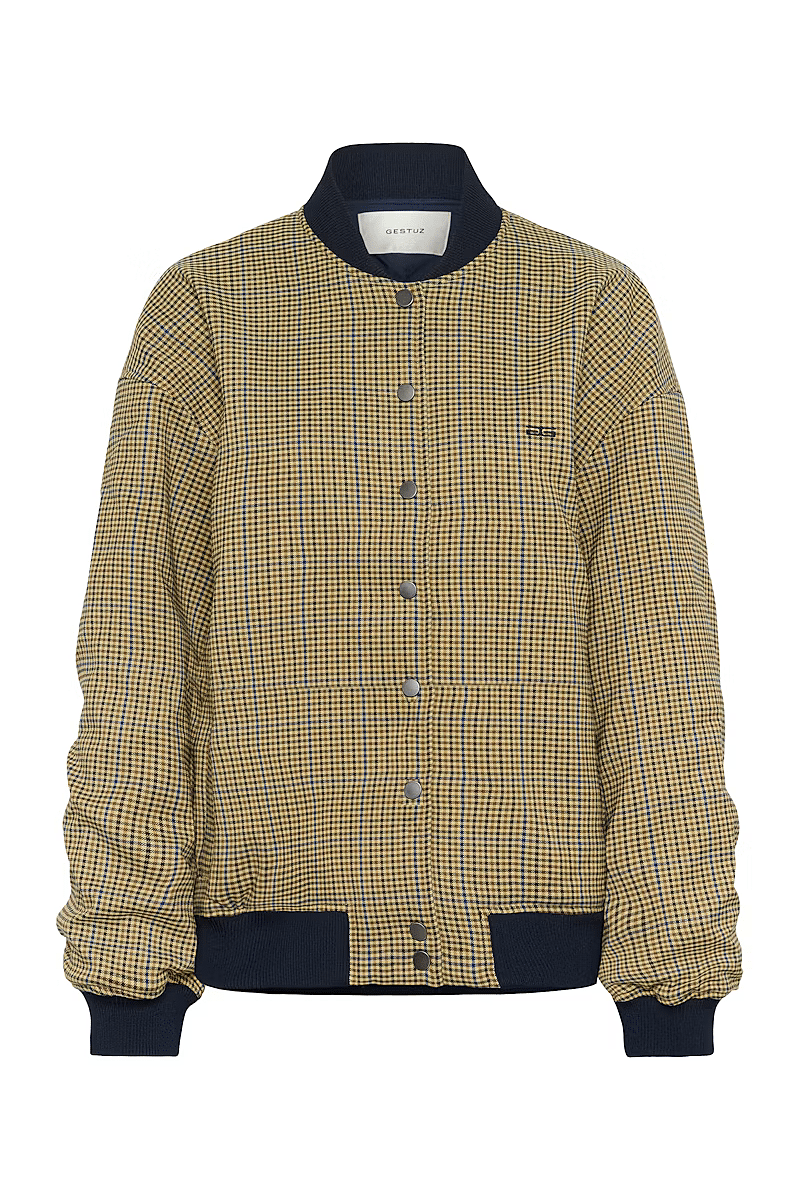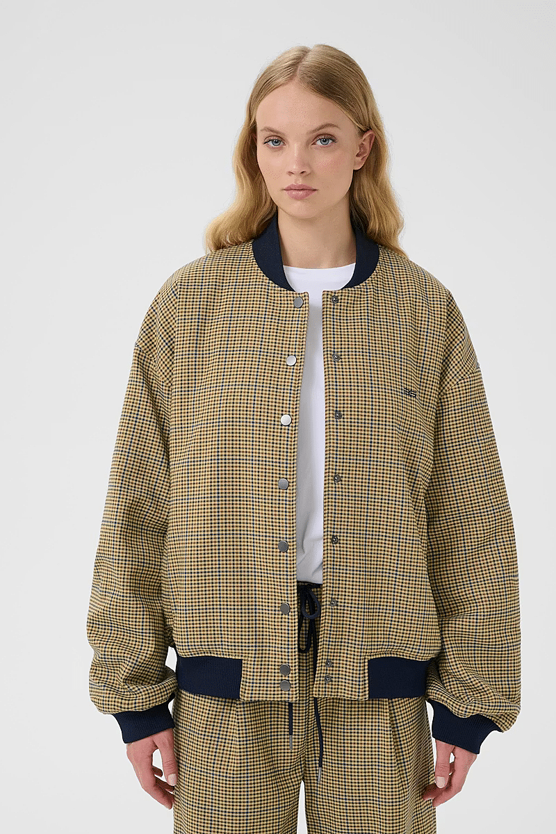 This checked bomber jacket by Gestuz features a loose fit, ribbed collar, cuffs and hem, full snap button closure, and subtle chest logo embroidery for a modern look.