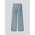 This is a pair of jeans by Modström with wide legs in cotton denim in a light blue wash. IsoldeMD pants have a high waist, front and back pockets and a tie band at the waist.