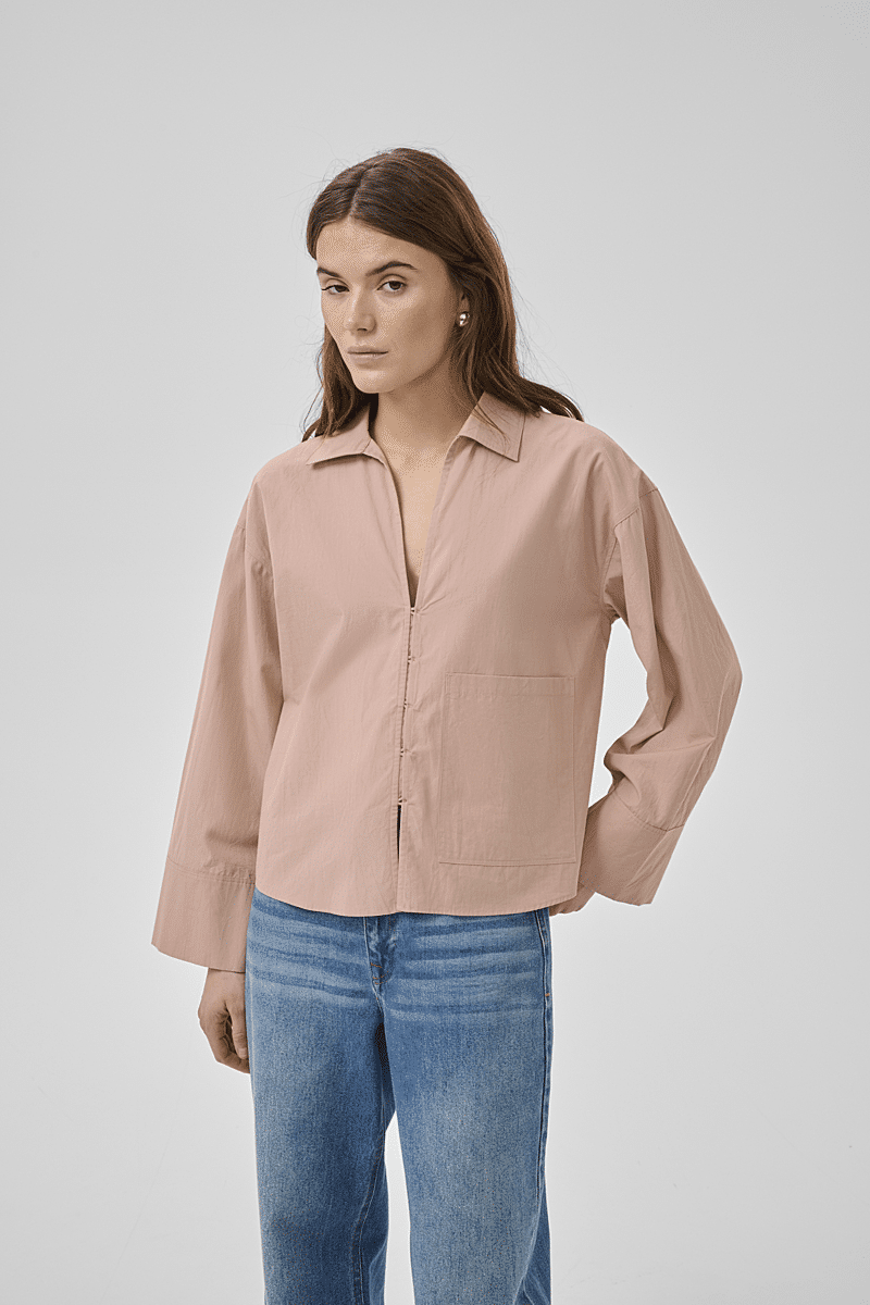 This boxy fit shirt by My Essential Wardrobe has a deep V-neckline and invisible button closing. Large patched pocket at the front