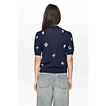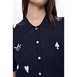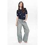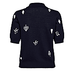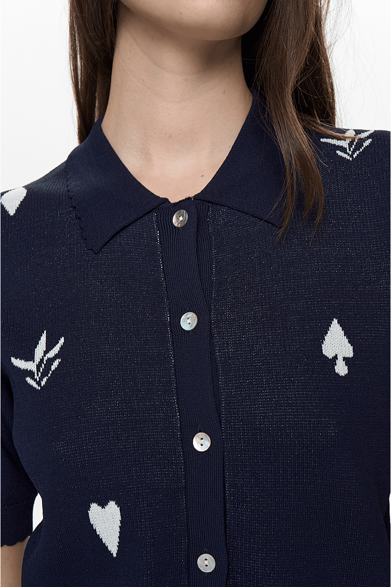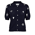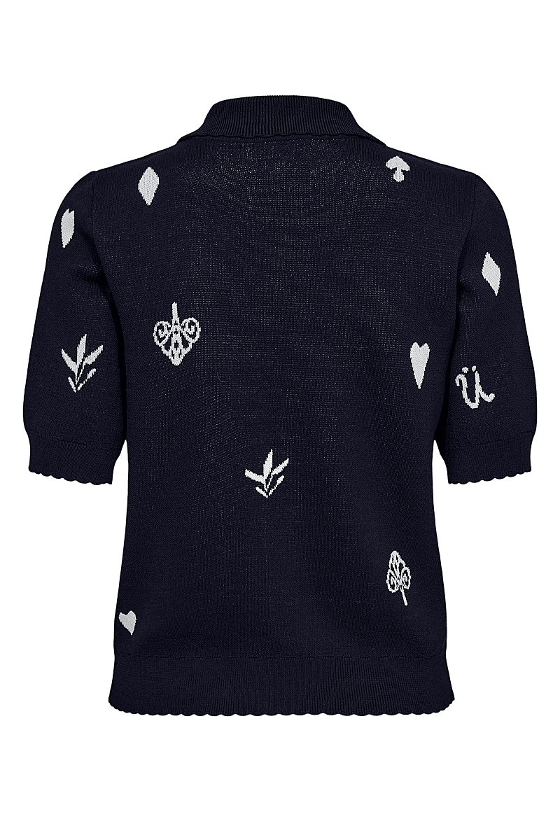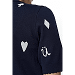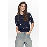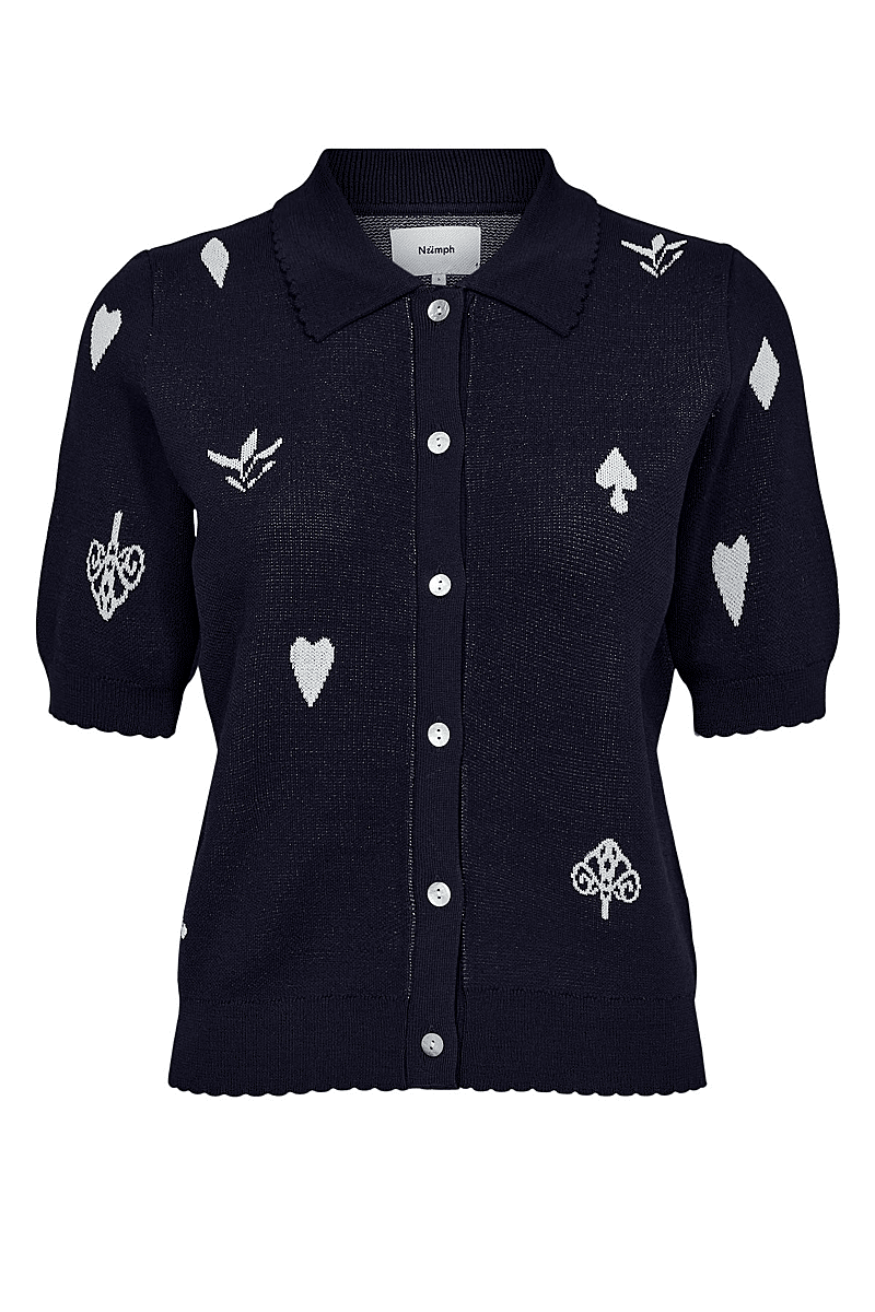 This is a short cardigan by Nümph with short, slightly puffed sleeves, button closure at front, a flat collar and a fun pattern all over