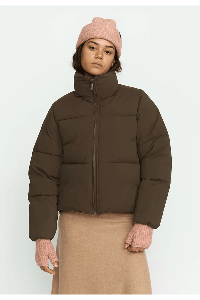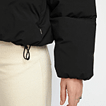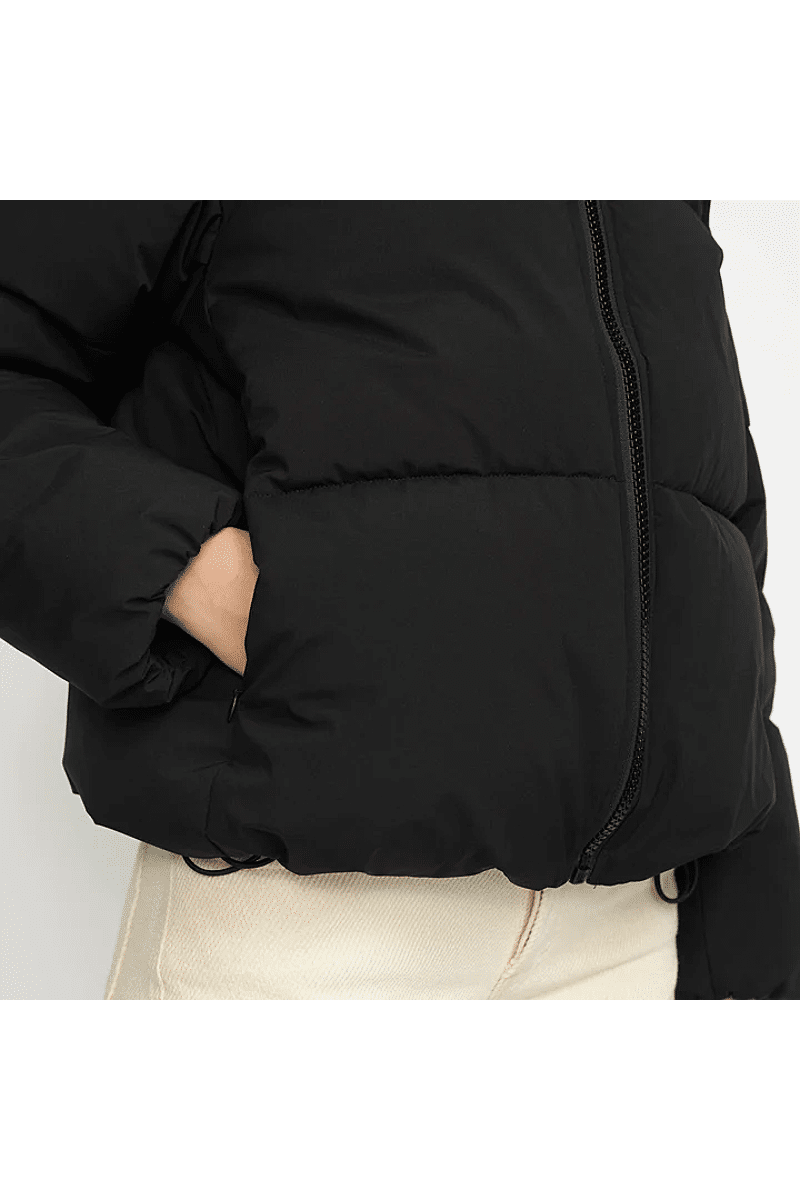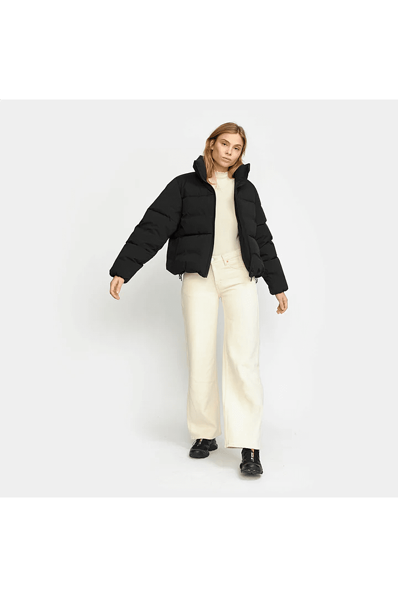 This puffer jacket in a subtle cropped design by Selfhood is made of a thin stretchable recycled polyester fabric. The puffer jacket is made with a bold tone in tone Vislon zipper, a standup collar, and an adjustable bottom hemline. The side-pockets with hidden zippers are lined with warm fleece lining for extra comfort. The water-repellent Teflon EcoElite coating is environmentally friendly, free of harmful fluorocarbon. The warm and highly compressible insulation is a DuPont Sorona Padding, a fiber partially made with renewable plant-based ingredients and produced with particular attention towards the environment