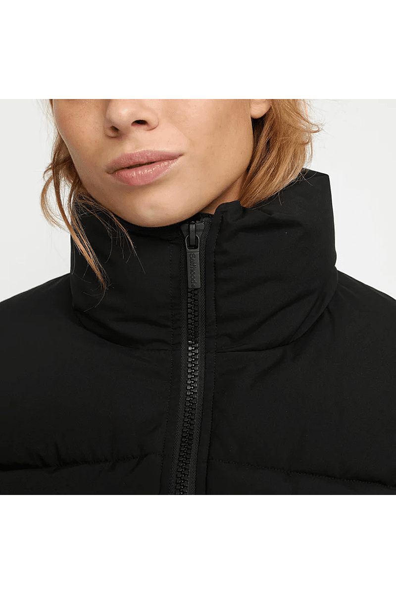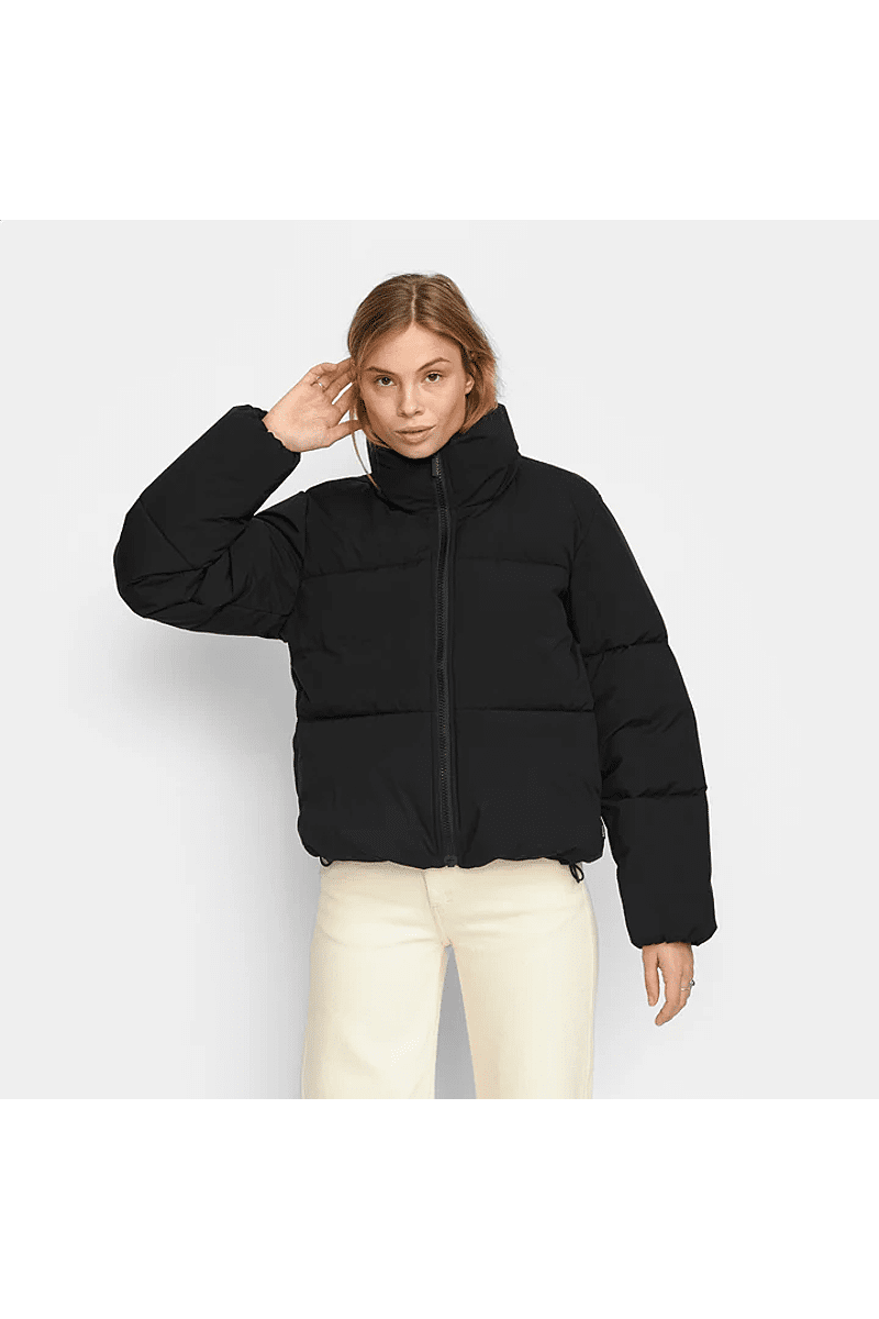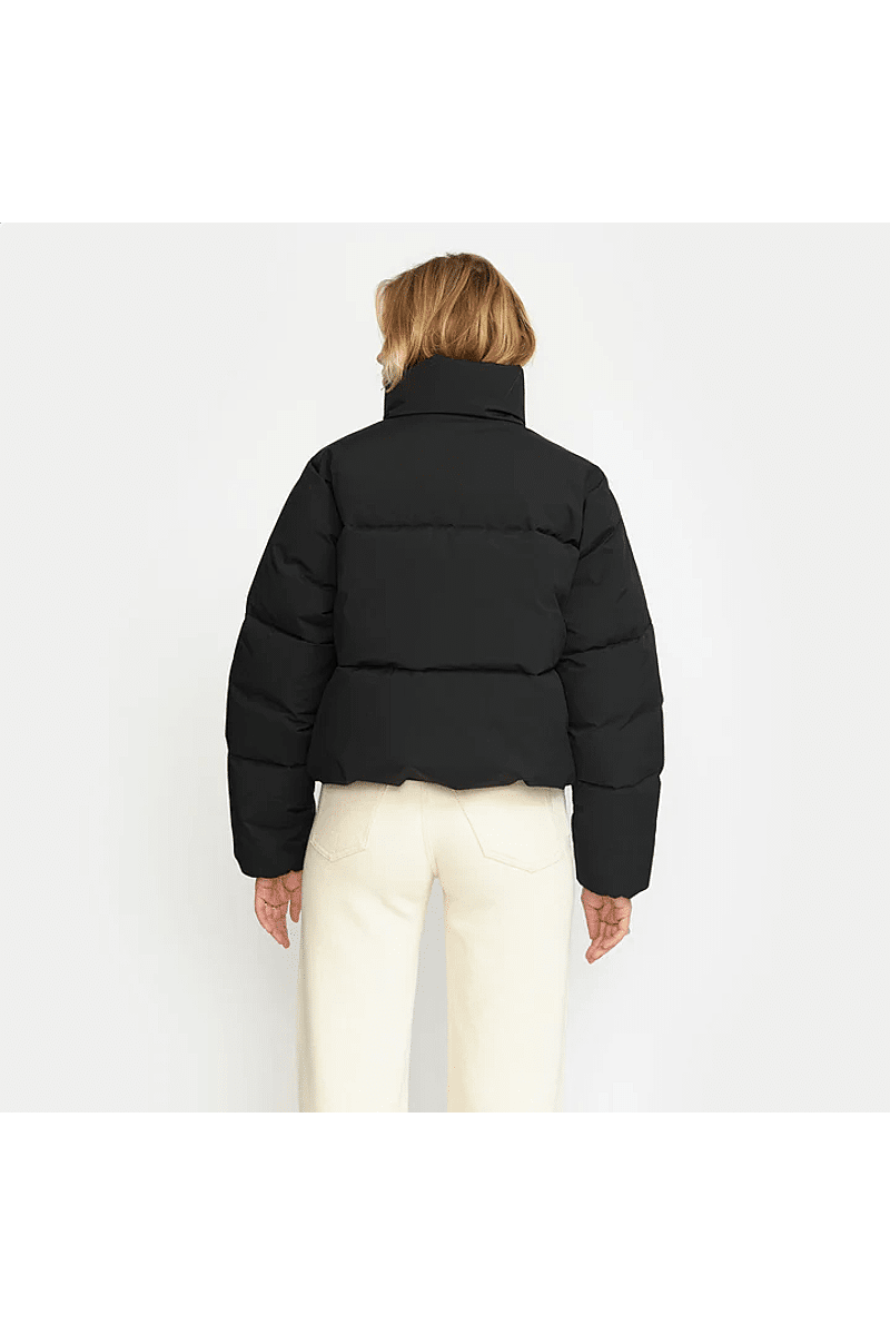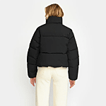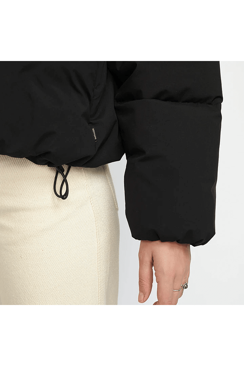 This puffer jacket in a subtle cropped design by Selfhood is made of a thin stretchable recycled polyester fabric. The puffer jacket is made with a bold tone in tone Vislon zipper, a standup collar, and an adjustable bottom hemline. The side-pockets with hidden zippers are lined with warm fleece lining for extra comfort. The water-repellent Teflon EcoElite coating is environmentally friendly, free of harmful fluorocarbon. The warm and highly compressible insulation is a DuPont Sorona Padding, a fiber partially made with renewable plant-based ingredients and produced with particular attention towards the environment