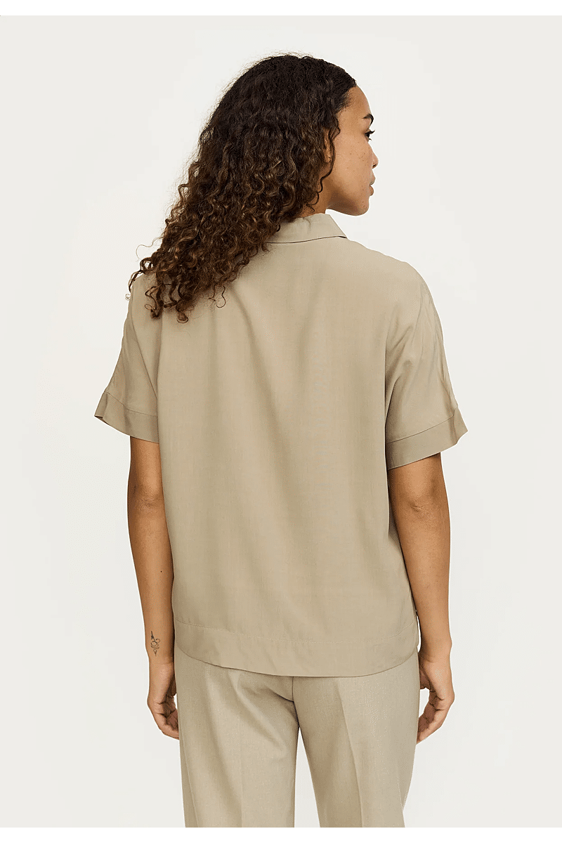 This is a loose fitted short sleeves shirt by Soft Rebels. It has wide shoulders and a hidden button closure at front / Full length is 61 cm in size S