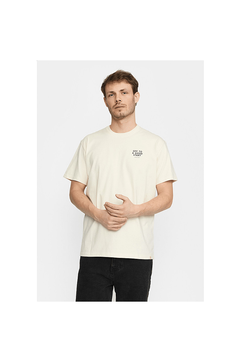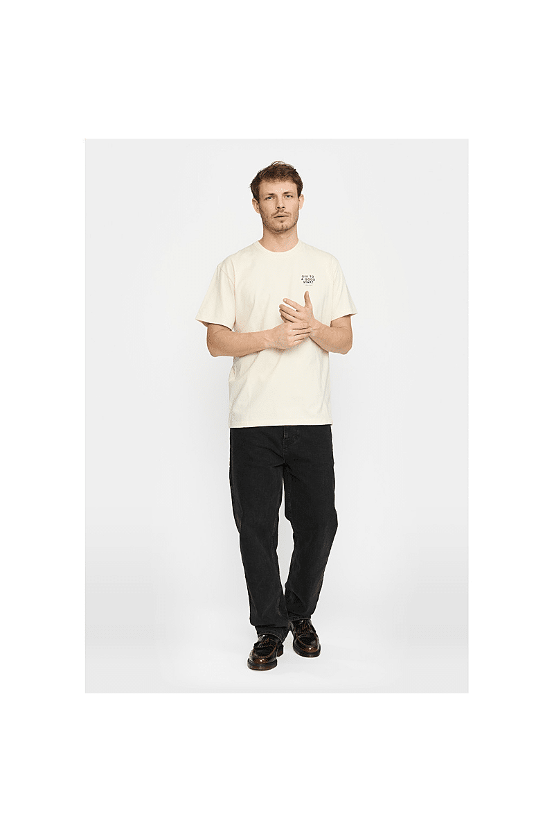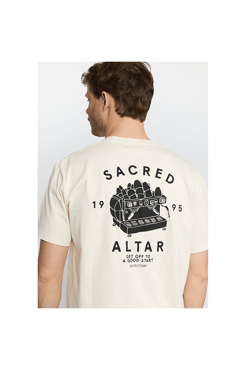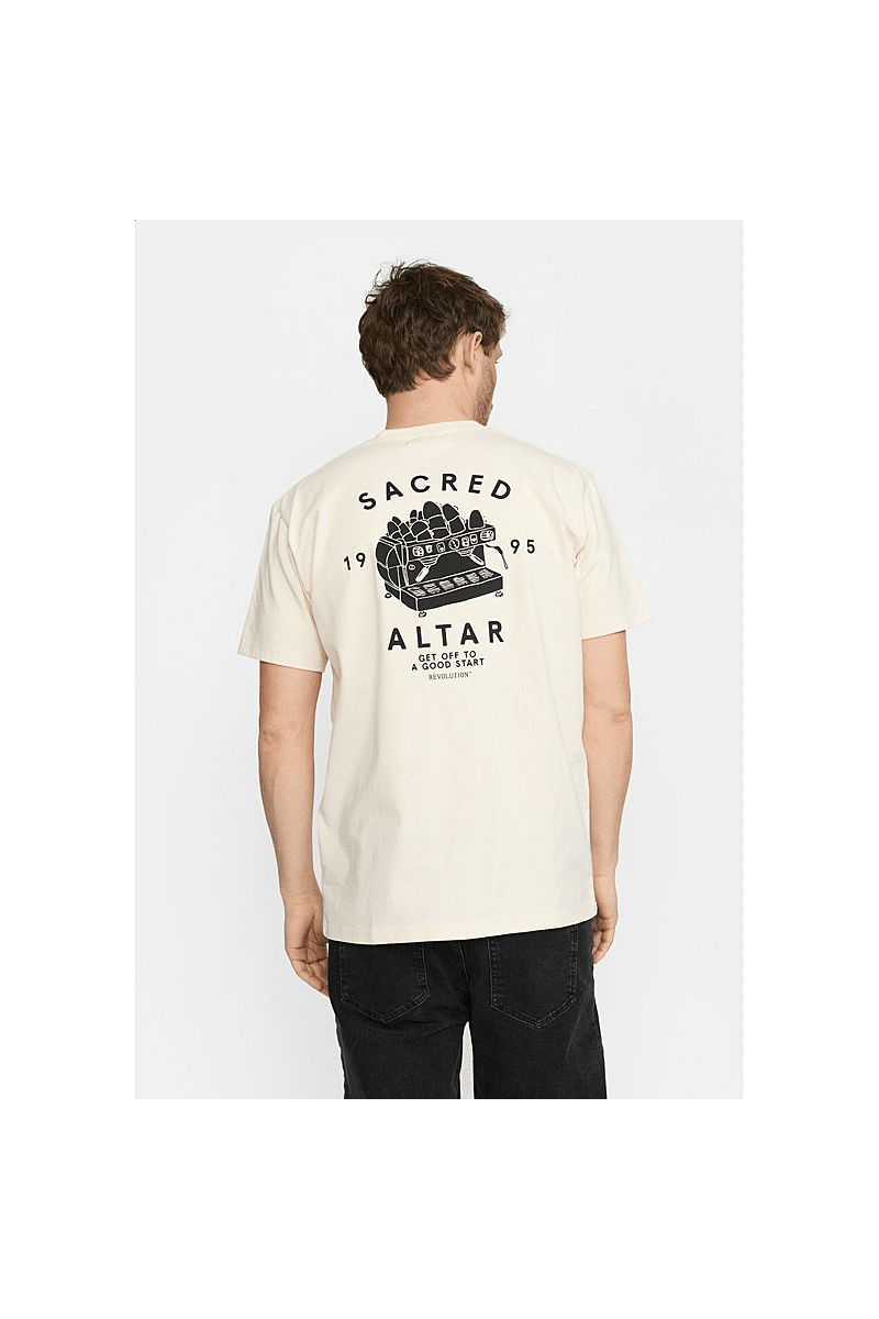 Dit is een losvallend t-shirt van Revolution met een ronde hals en korte mouwen, gemaakt van een jersey van biologisch katoen, met een gewicht van 220 GSM. Het t-shirt heeft een grote grafische print op de achterkant en een kleine print op de borst. De zware jerseystof die knapperig aanvoelt, zorgt voor stabiliteit en duurzaamheid van het T-shirt.