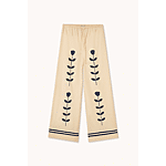 Dit is een katoen-linnen poplin broek van The Tiny Big Sister met bloemenprint en gestreepte zoomdetails. Lichte crèmebasis. Ontworpen met een elastische tailleband en een verstelbare veterband. Lichtgewicht en ademend.