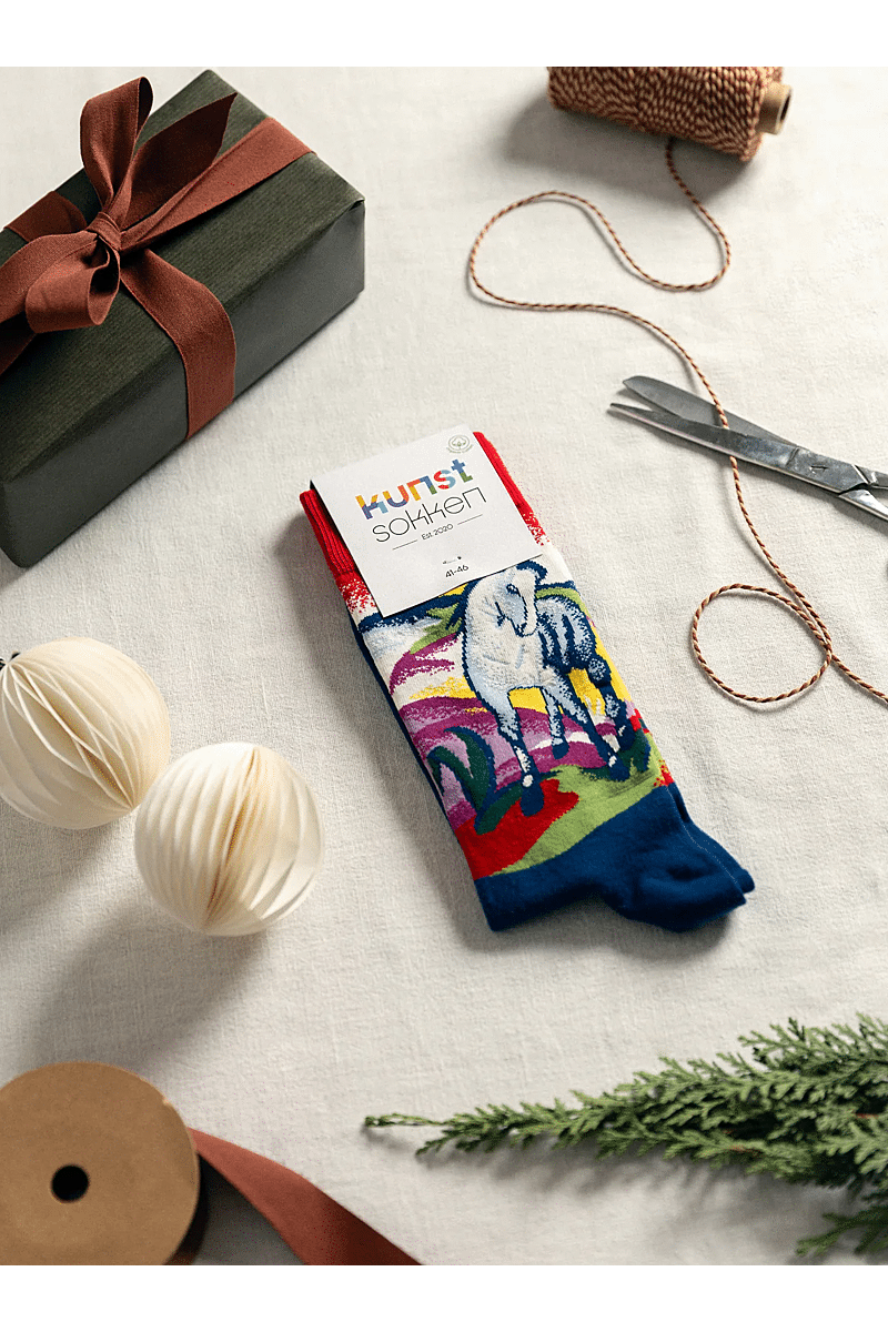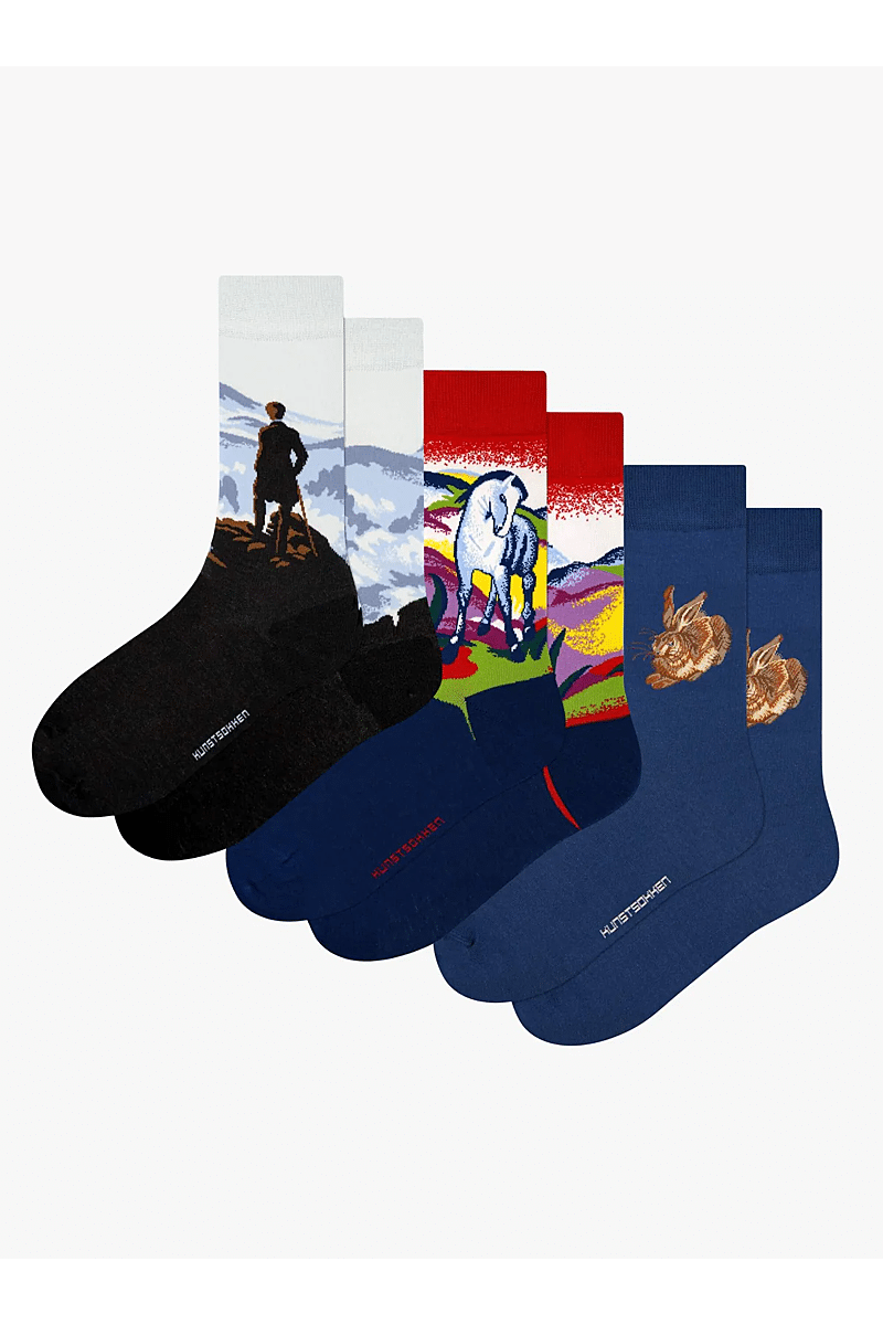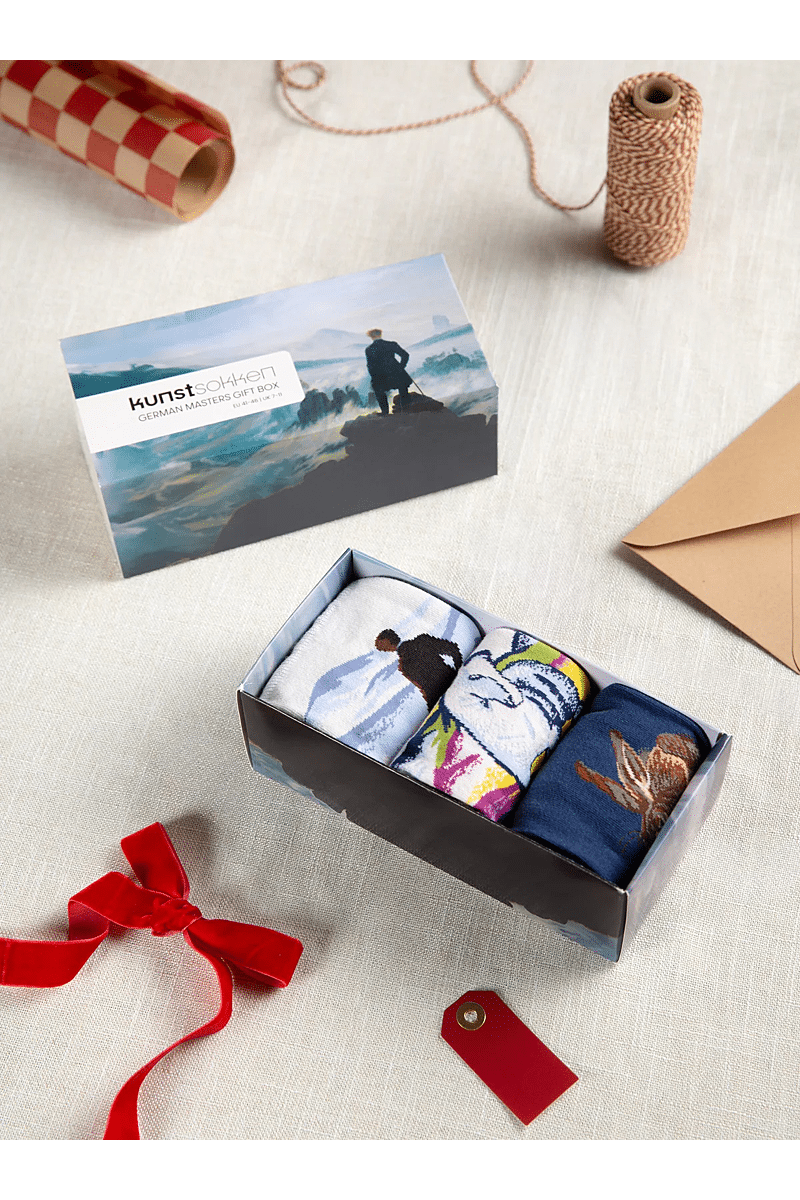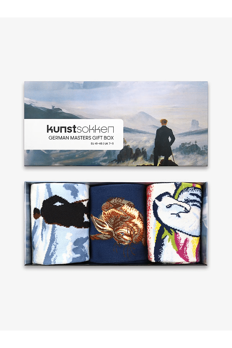Deze exclusieve gift box van Kunstsokken combineert drie iconische werken van de Duitse meesters Caspar David Friedrich, Albrecht Dürer en Franz Marc. Drie Duitse meesterwerken in een stijlvolle verpakking, perfect voor liefhebbers van Duitse kunst die een uniek cadeau zoeken.