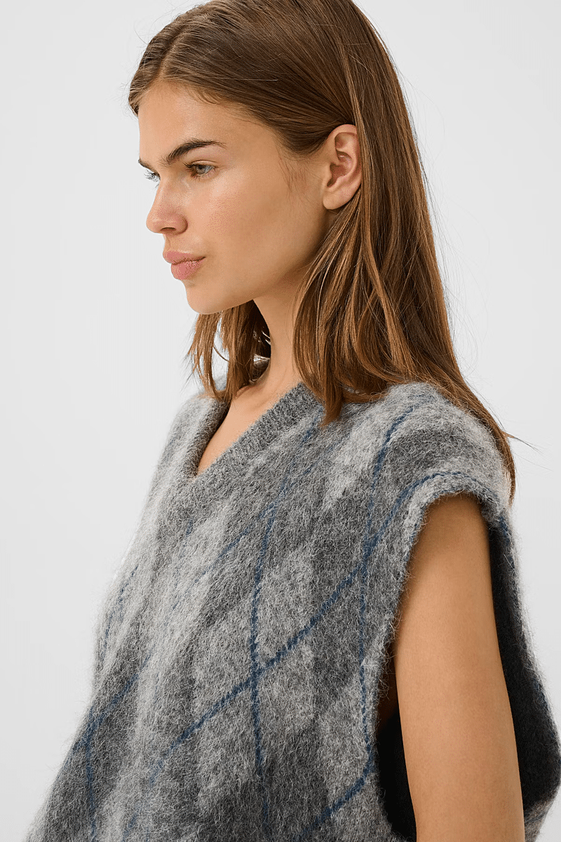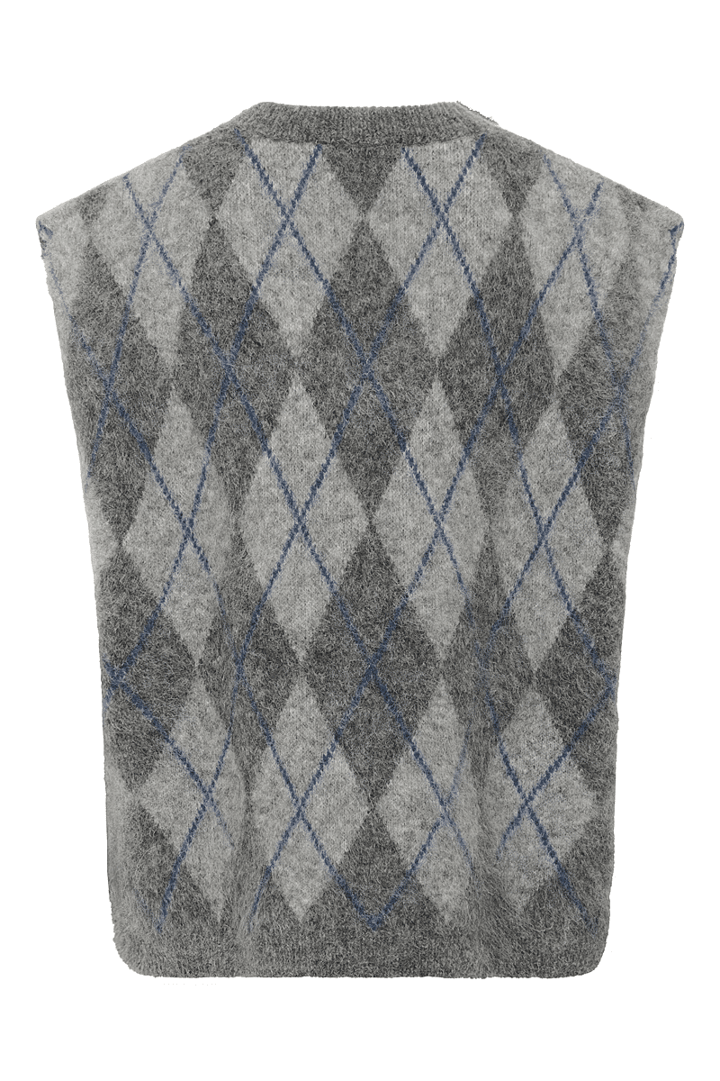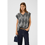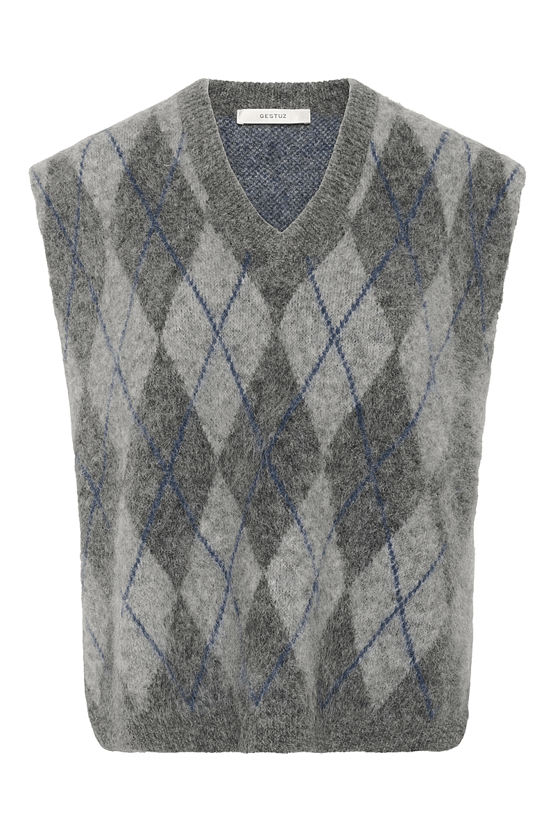 Dit is een mouwloos gebreid vest van zachte stof met argylepatroon van Gestuz. Ontworpen met een V-hals en een relaxte pasvorm, perfect om als laagje te dragen.