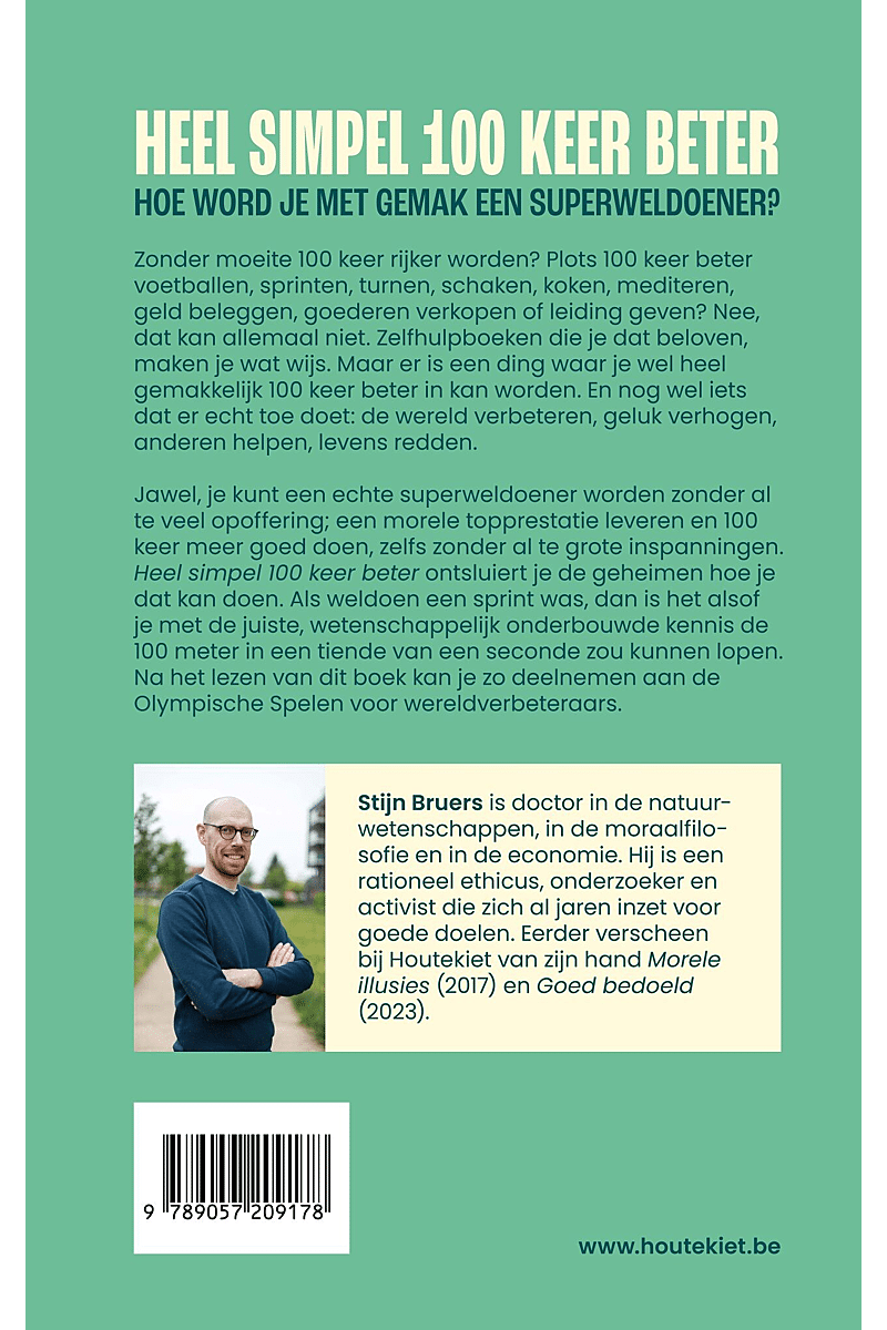 Jawel, je kunt een echte superweldoener worden zonder al te veel opoffering; een morele topprestatie leveren en 100 keer meer goed doen, zelfs zonder al te grote inspanningen. Heel simpel 100 keer beter ontsluiert je de geheimen hoe je dat kan doen. Als weldoen een sprint was, dan is het alsof je met de juiste, wetenschappelijk onderbouwde kennis de 100 meter in een tiende van een seconde zou kunnen lopen. Na het lezen van dit boek kan je zo deelnemen aan de Olympische Spelen voor wereldverbeteraars.