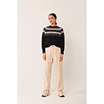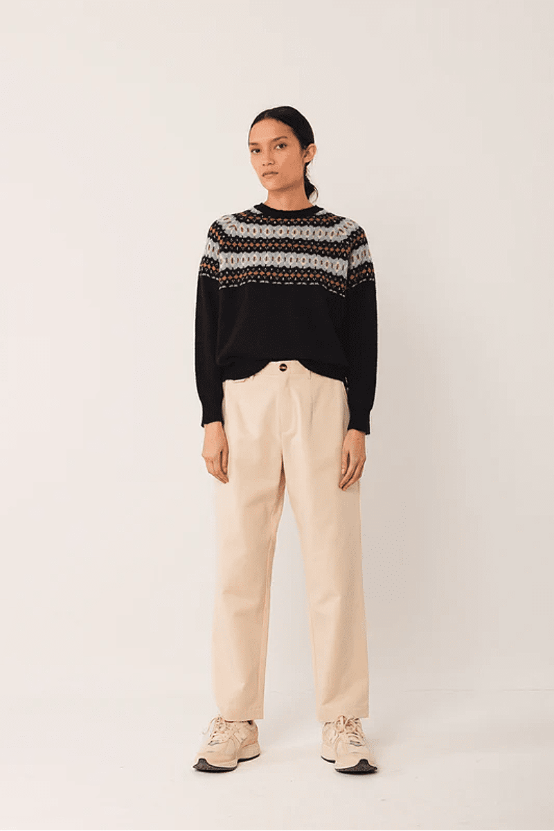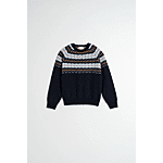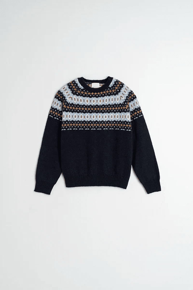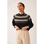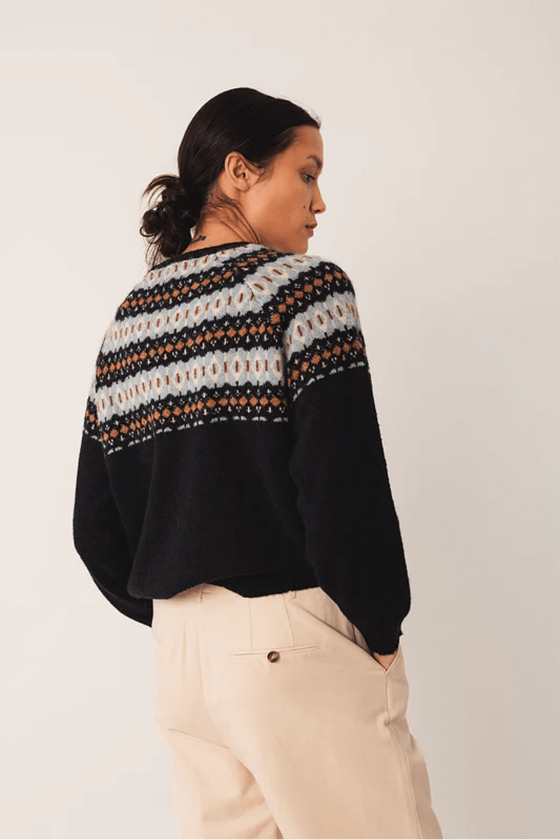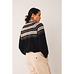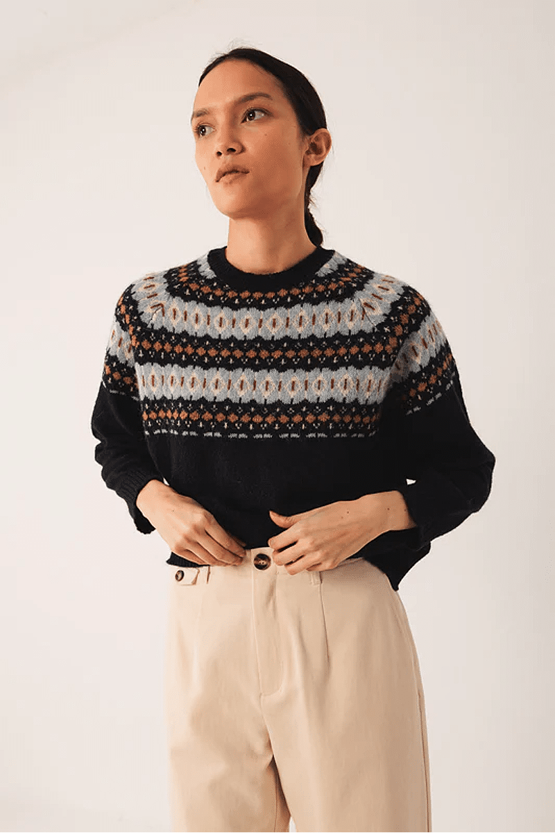 Dit is een gebreide trui van Indi & Cold met een veelkleurige jacquardrand aan de voor- en achterkant, en raglanmouwen. Geribde boorden aan manchetten en zoom.