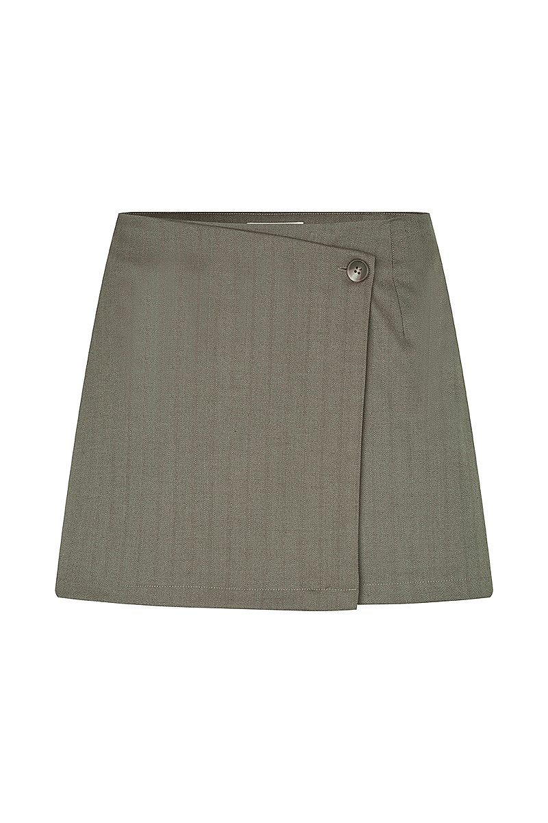Dit is een rok van Modström met een asymmetrische look. De Pedromd rok is kort en sluit met een knoopje aan de voorkant.