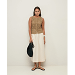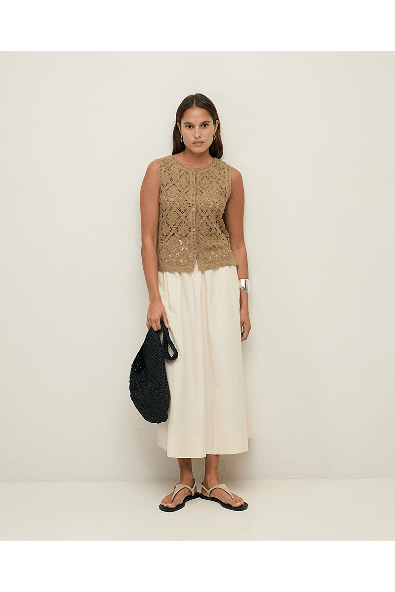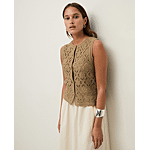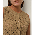 Dit is een gebreid mouwloos vest met gehaakt effect van kaki katoen. Rechte snit, ronde halslijn en knoopsluiting aan de voorkant. Zijsplitten aan de zoom.