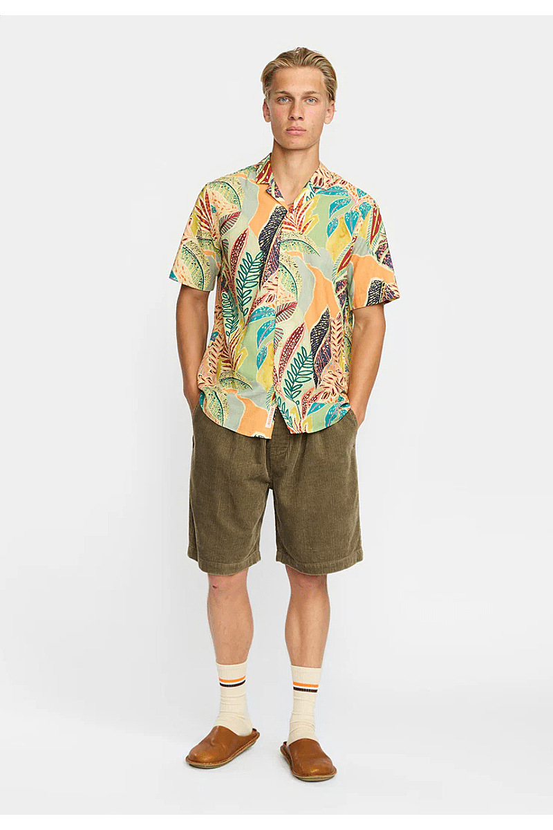 Dit Cubaanse shirt met korte mouwen van Revolution is gemaakt van een lichtgewicht biologische katoenen stof met een weefsel van dunne en dikke draden waardoor het shirt een karakteristieke grove structuur krijgt. Deze kleurrijke all-over print is trouw aan het klassieke Cubaanse overhemd en is geïnspireerd op de tropische jungle. Het overhemd heeft een knoopsluiting aan de voorzijde afgewerkt met 4-gaats ton sur ton knopen en een Cubaanse kraag. De zoom is gebogen zodat je hem gemakkelijk met laagjes kunt dragen, en de achterkant is ontworpen met een traditioneel dubbellaags schouderstuk met stolpplooi voor extra comfort