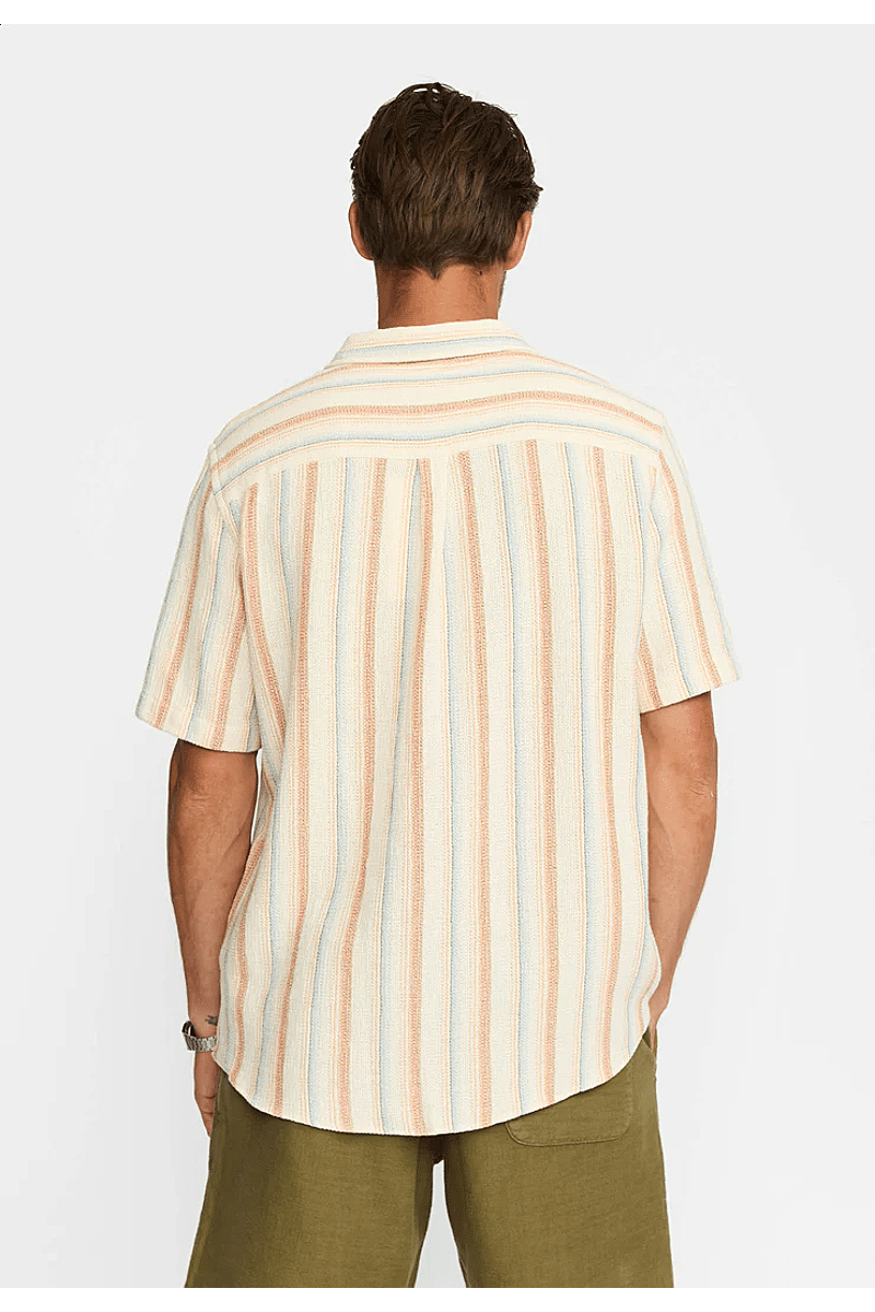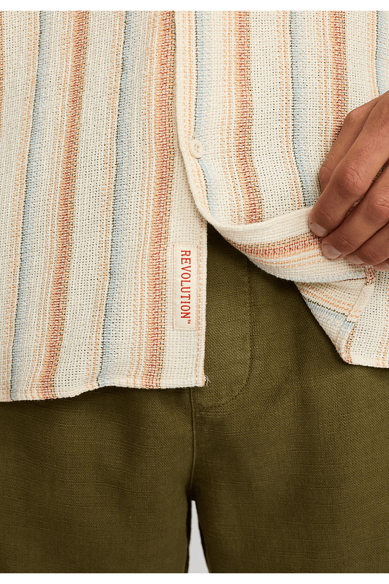 Dit Cubaanse shirt met korte mouwen van Revolution is geschikt voor dagelijks gebruik en is gemaakt van een middelzware, gestructureerde katoen-polyesterstof met een licht open structuur, waardoor het shirt ademend en comfortabel is voor warme zomerdagen. Het verticale streepmotief dat het shirt karakter geeft, is geverfd met garenverf. Geverfde stof wordt gemaakt door de garens voor te verven voordat ze worden geweven, wat zorgt voor een betere kleurechtheid en duurzaamheid. Het shirt heeft een knoopsluiting aan de voorkant met 4 ton-sur-ton knopen en een Cubaanse kraag. De zoom is afgerond voor gemakkelijk combineren met andere kledingstukken en de achterkant is ontworpen met een traditioneel dubbellaags schouderstuk met een plooi voor extra comfort en bewegingsvrijheid.