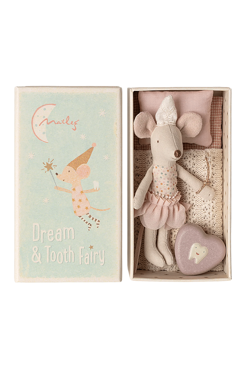 's Nachts verspreidt de tandenfee sprookjesstof, verzamelt tanden en brengt lekkernijen en zorgt ervoor dat je zoete dromen hebt. Magisch gekleed en slaapt lekker in zacht beddengoed - inclusief tandendoosje en luciferdoosje.