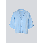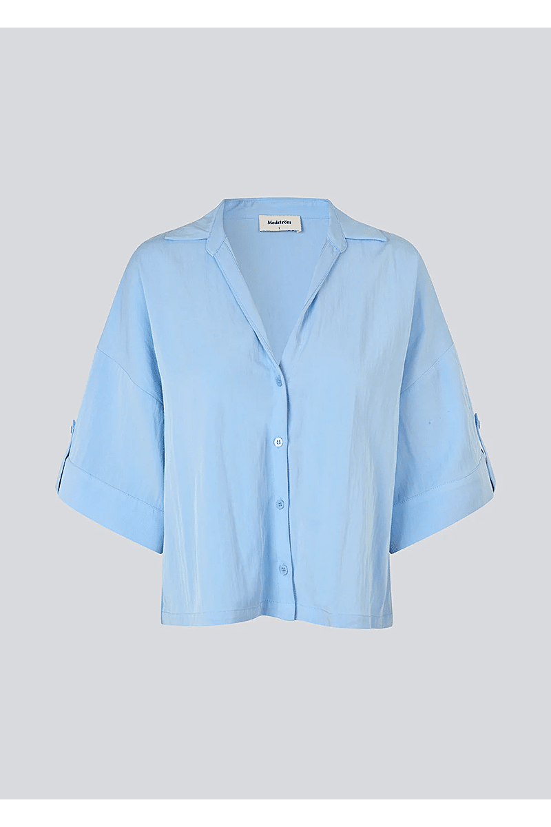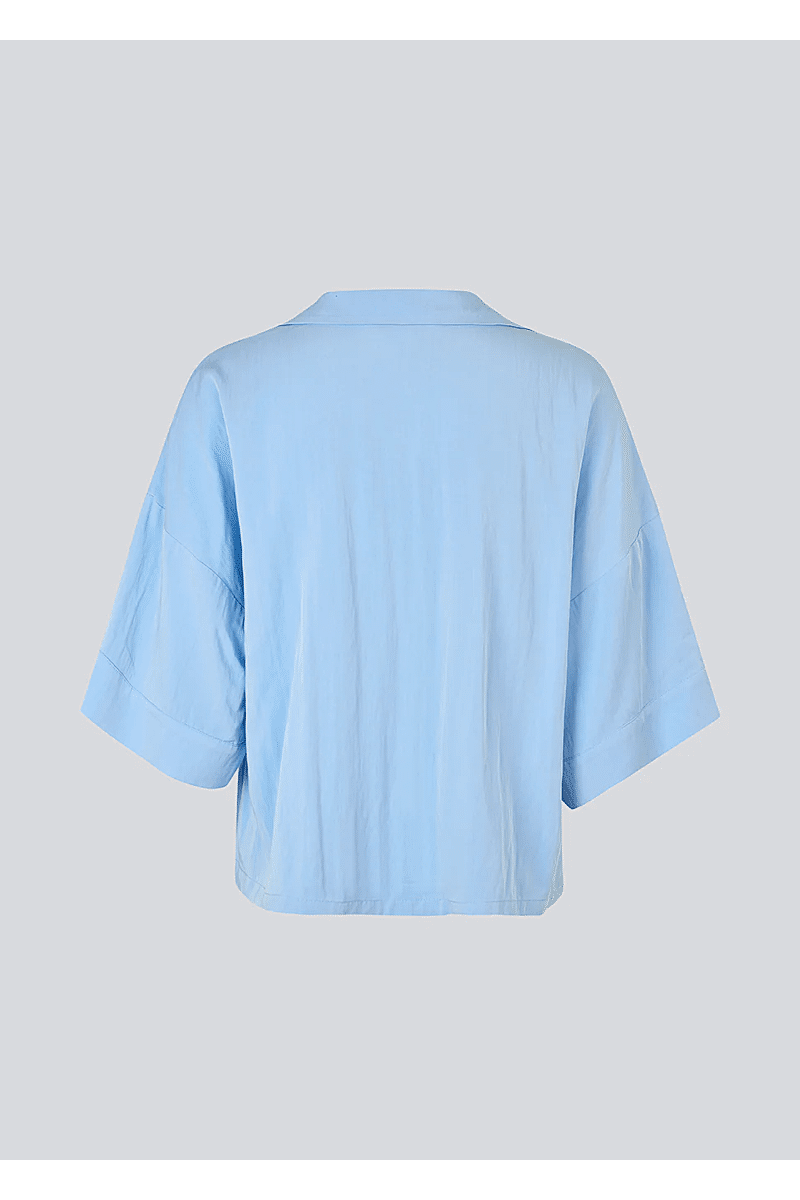 Minimalistisch shirt van Modström met wijde 3/4 mouwen. Het UddinMD Shirt heeft een losse en comfortabele pasvorm, een klassieke overhemdkraag, een vrouwelijke V-hals en knoopsluiting.