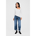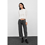 Deze low waist jeans van Mus & Bombon heeft wijde pijpen en een naar buiten gevouwen zoomdetail. Klassieke zakken en vijf riemlussen. Perfect voor een relaxte, moderne stijl.