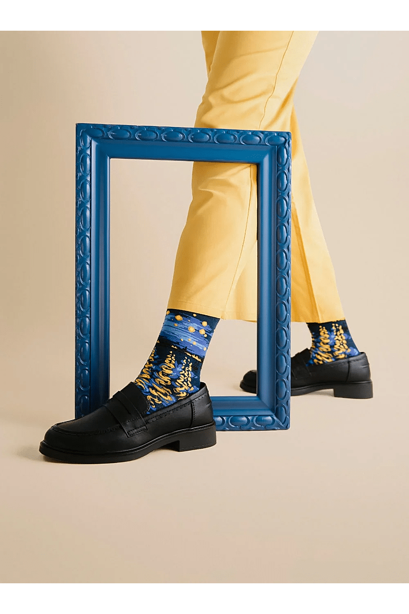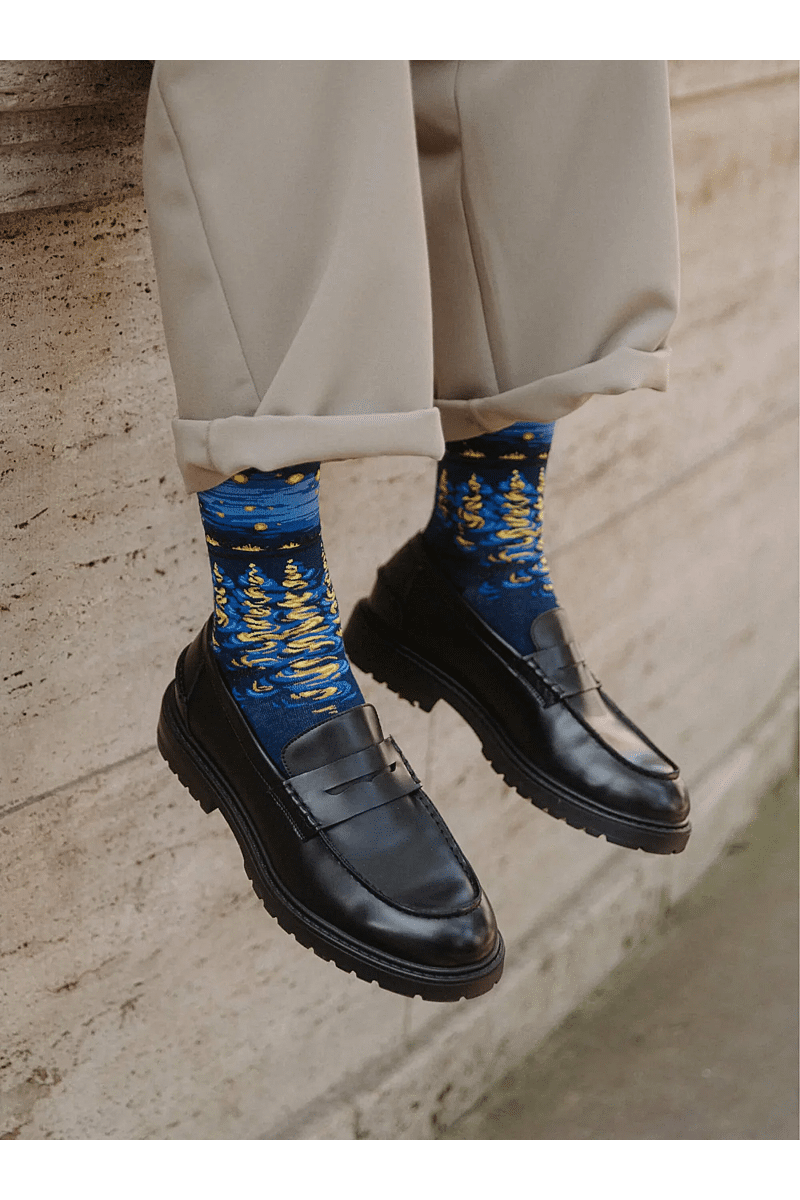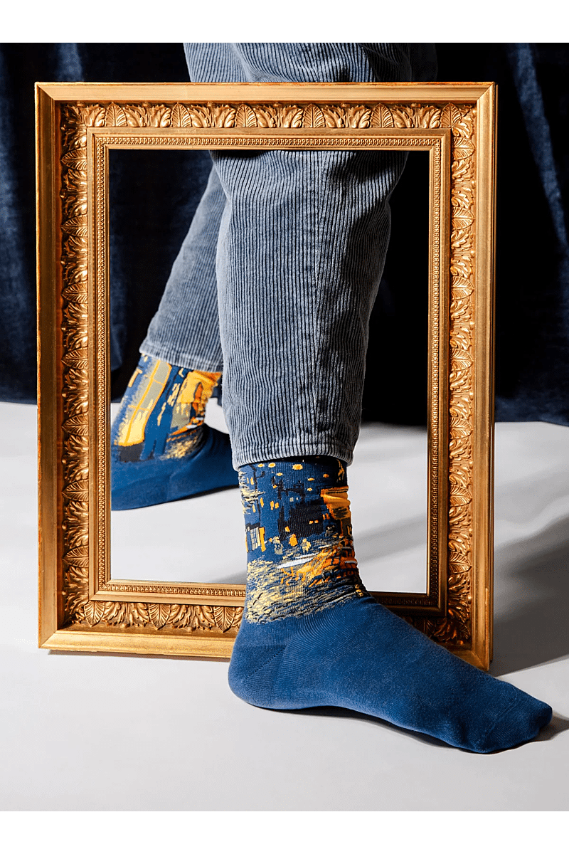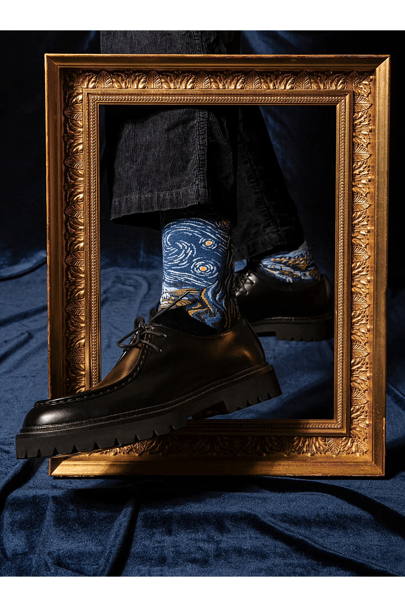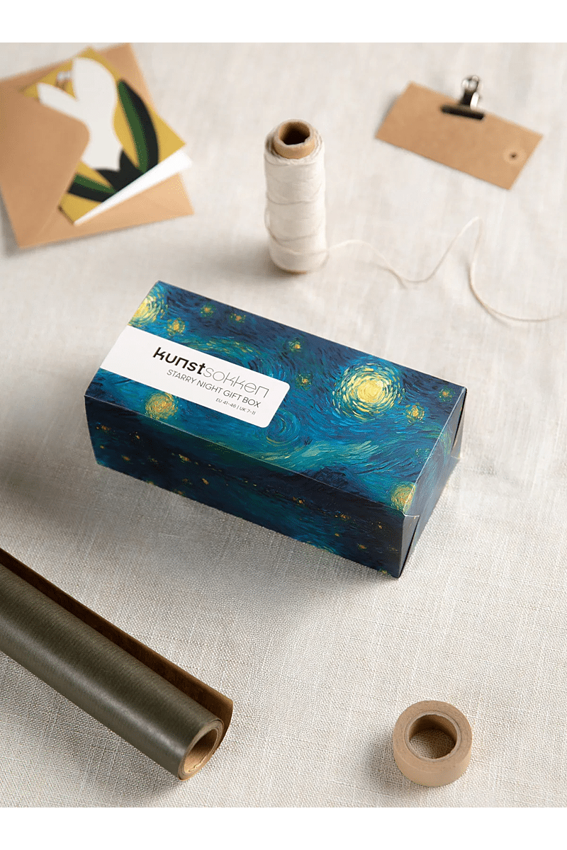 De verpakking is ontworpen om Van Gogh’s kunst te eren, met verfijnde details die de sokken prachtig aanvullen.