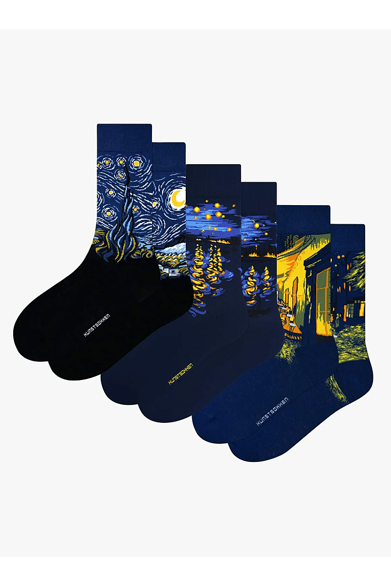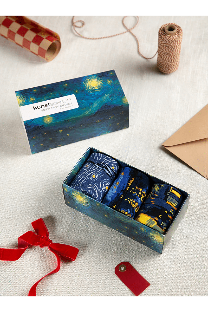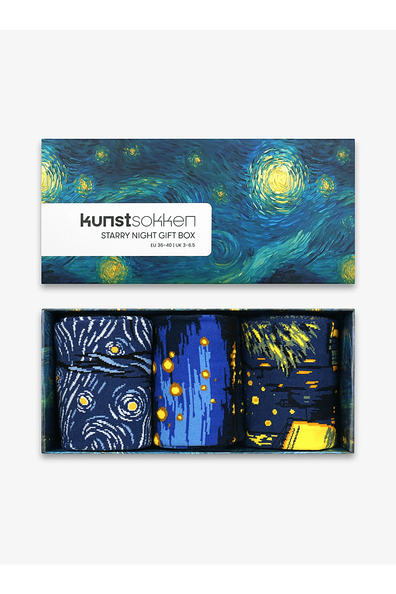 Deze exclusieve gift box van Kunstsokken combineert drie prachtige werken van Vincent van Gogh die allemaal geïnspireerd zijn door de sterrenhemel. De drie werken komen in een stijlvolle verpakking, perfect voor liefhebbers van impressionistische kunst die een uniek cadeau zoeken.